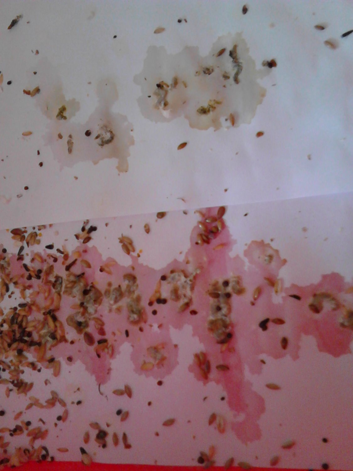 Grazie mille. Le foto sono state scattate verso le 11 di stamattina. Allego foto delle feci del maschio e della femmina che sta covando. Non so se lasciare il divisorio, levarlo, o mettere in maschio proprio in una altra gabbia.