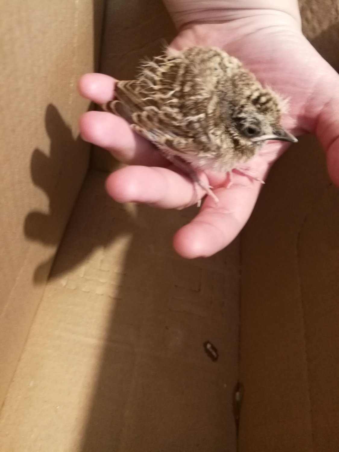 è un pullo di allodola o della famiglia delle allodole ,andrebbe riportato immediatamente dove è stato trovato ,ma possibile che la gente non può fare a meno di interferire nella natura?non c'è rimedio..