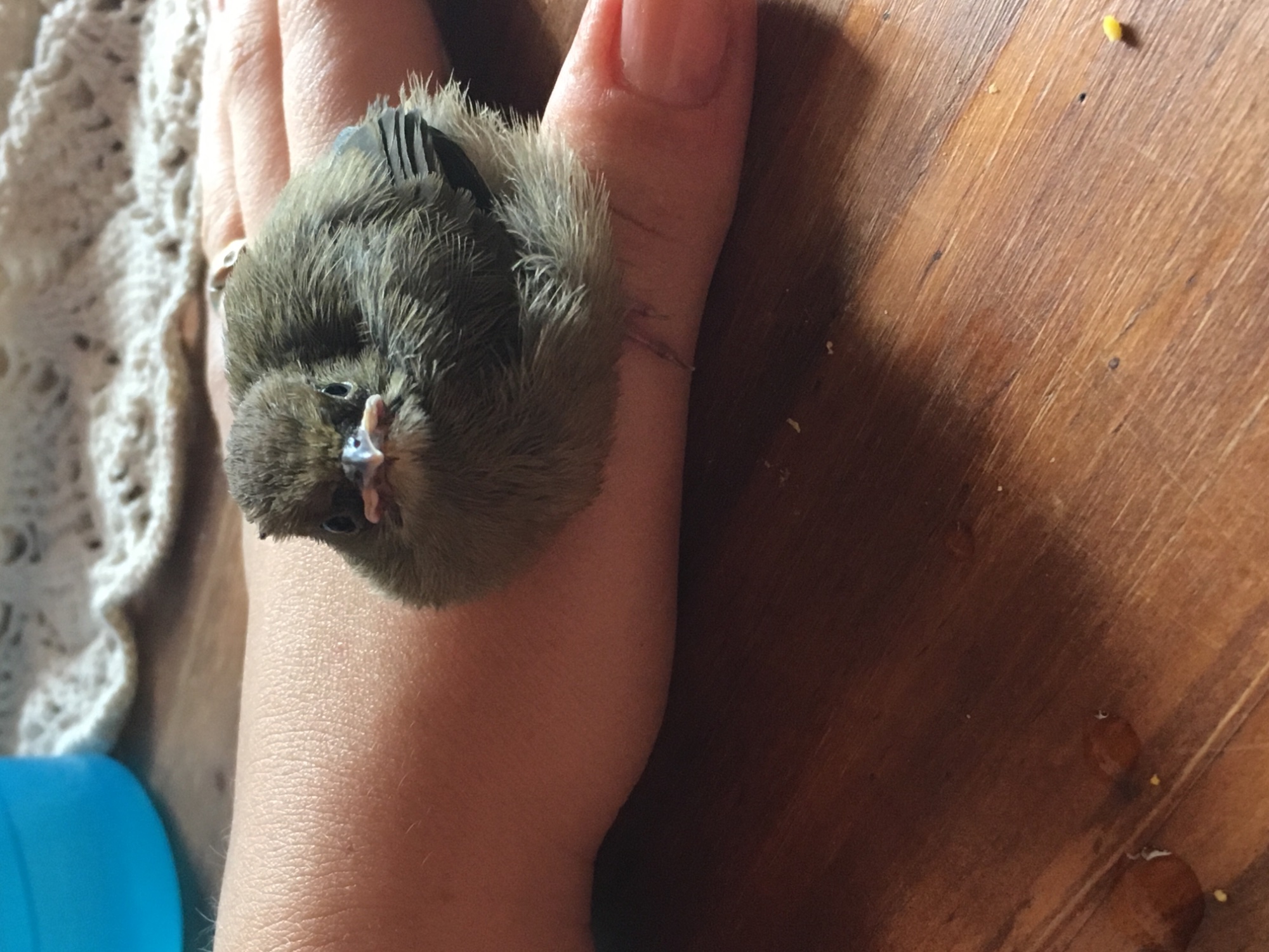 Mi sono appena iscritta al forum. Più di due settimane fa, dopo un forte temporale, ho trovato in mezzo alla strada questo uccellino. Non riusciva a volare. L’ho preso con me. Sinceramente pensavo morisse perché era veramente piccino, invece è ancora con noi. Sta imparando a beccare cibo da solo e a bere da solo. Sta in giro in casa con noi. Vorrei sapere se sapete che tipo di uccello sia.