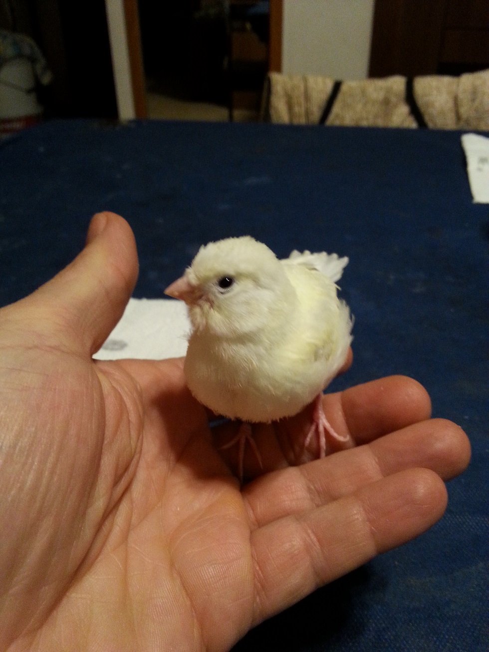 Raffo il mio ha paura... Non pigola mai e adesso svolazza quando voglio prenderlo, al contrario dell'altro alimentato dai genitori mangiucchia cmq già da solo il pasticcino e gli ho aggiunto dei semi per farlo abituare. Nell'acqua metto il multivitaminico ho messo anche le spighe di panico e ieri una fettina di mela ma non mi sembra voglia provare ad assaggiare. Speriamo bene! Un anno fa un canarino che mi è poi morto dormiva con la testa penzoloni.... :(