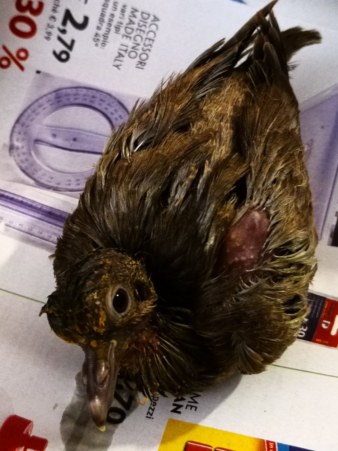 Buonasera a tutti. Ieri ho trovato su un marciapiede un pullo che credo sia di tortora (ce ne sono tantissime qui). Ho iniziato da subito a dargli tuorlo d'uovo e da questa mattina pastone. Credo che non stia benissimo. Dentro la scatola non sta in piedi sulle zampette ma è sempre coricato su un fianco, dorme molto e ogni tanto gira la testa come se volesse fargli fare un giro di 360 gradi. Sapete a cosa potrebbe essere dovuto questo comportamento?