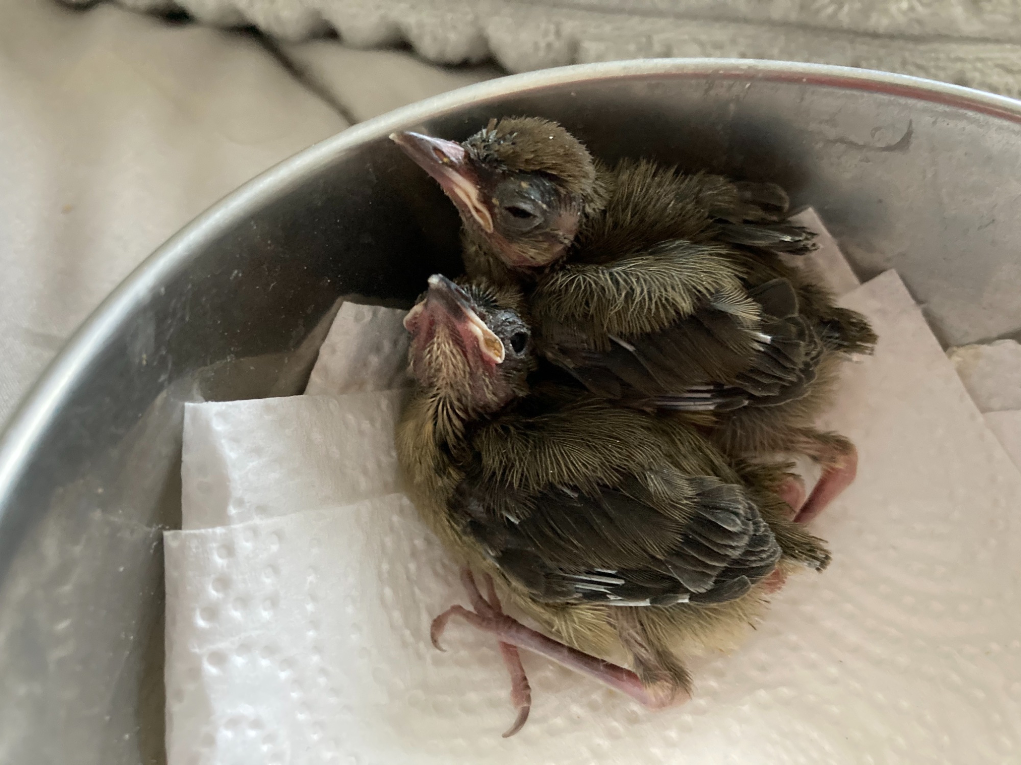 Buongiorno a tutti, ho 4 pulli che presumo siano di merlo, ma mi sembrano parecchio piccoli, allego una foto con moneta per capire le proporzioni.. il nido è stato trovato in una siepe tagliata per errore, nido bello rotondo come quello dei merli.. l’unico dubbio sta proprio nelle proporzioni di questi pulli che sono davvero minuscoli sembrano pulli di passerotto.. inoltre vi chiedo se già impiumati così posso spegnere la lampada calda.. ora la temperatura si assesta tra i 25 e i 28 gradi.. posso tenerli già ai 20 gradi della stanza? Grazie mille in anticipo per le risposte!
