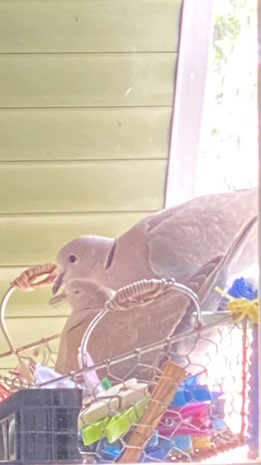 Sul davanzale della mia camera da l’erto ho attaccato alla barra delle tapparelle un cestino portaci appettò pieno di ci appettò da stendere ed è proprio lì che due giovani tortorelle hanno incominciato 7 giorni fa a fare il nido il giorno dopo hanno depositato un ovetto e il giorno dopo hanno incominciato a covare e poi davanti agli occhi esterrefatti miei e di mia figlia la femminuccia ne ha fatto un altro e da allora covano alternandosi l’uno con l’altra