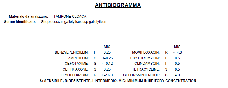 Invece ora presenta un altro problema. Verso luglio ha iniziato ad avere delle crisi di debolezza con cedimeto di una zampa (a volte la destra altre la sinistra), seguito da feci con bolle. Si era pensato fosse stato un insetticida al piretro utilizzato il giorno prima all'esterno (avendo le finestre aperte) ma poi escluso dal veterinario. Sono stati effettuati esami delle feci (nessun parassita) esami giardia (negativo). Alla fine dopo un'altra visita sono stati fatti dei tamponi, gozzo e cloaca. Quello alla cloaca (in cui è presente l'antibiogramma) è risultato positivo allo Streptococcus gallolyticus ssp gallolyticus. Il veterinario mi ha spiegato che uno dei pochi antibiotici che si potevano dare doveva essere fatto da una farmacia galenica ed era di difficile reperibilità. Dunque ha optato per Immunomix sciroppo e florentero bird. Fatta la cura la situazione non è cambiata. Ha meno crisi ma le bolle nelle feci son rimaste. Inoltre i giorni in cui ha questa crisi le feci presentano già da prima più bolle del solito. Mi ha detto di tenerlo sotto osservazione e fare cicli di florentero, che continuo tutt ora a fare ma senza particolari risultati. Qualcuno sa qualcosa a riguardo? O può aiutarmi? Vi mando l'esame con l'antibiogramma e qualche foto. Grazie mille