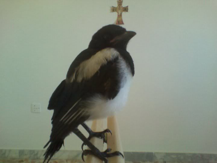 Ciao anche io ho trovato una gazza ma è molto piccola la sua coda si vede a stento....sotto il collo è un po calva e sulle ali si vede un po l'osso delle ali....io penso che sia normale dato che sia piccola ancora non sviluppa tutte le penne....