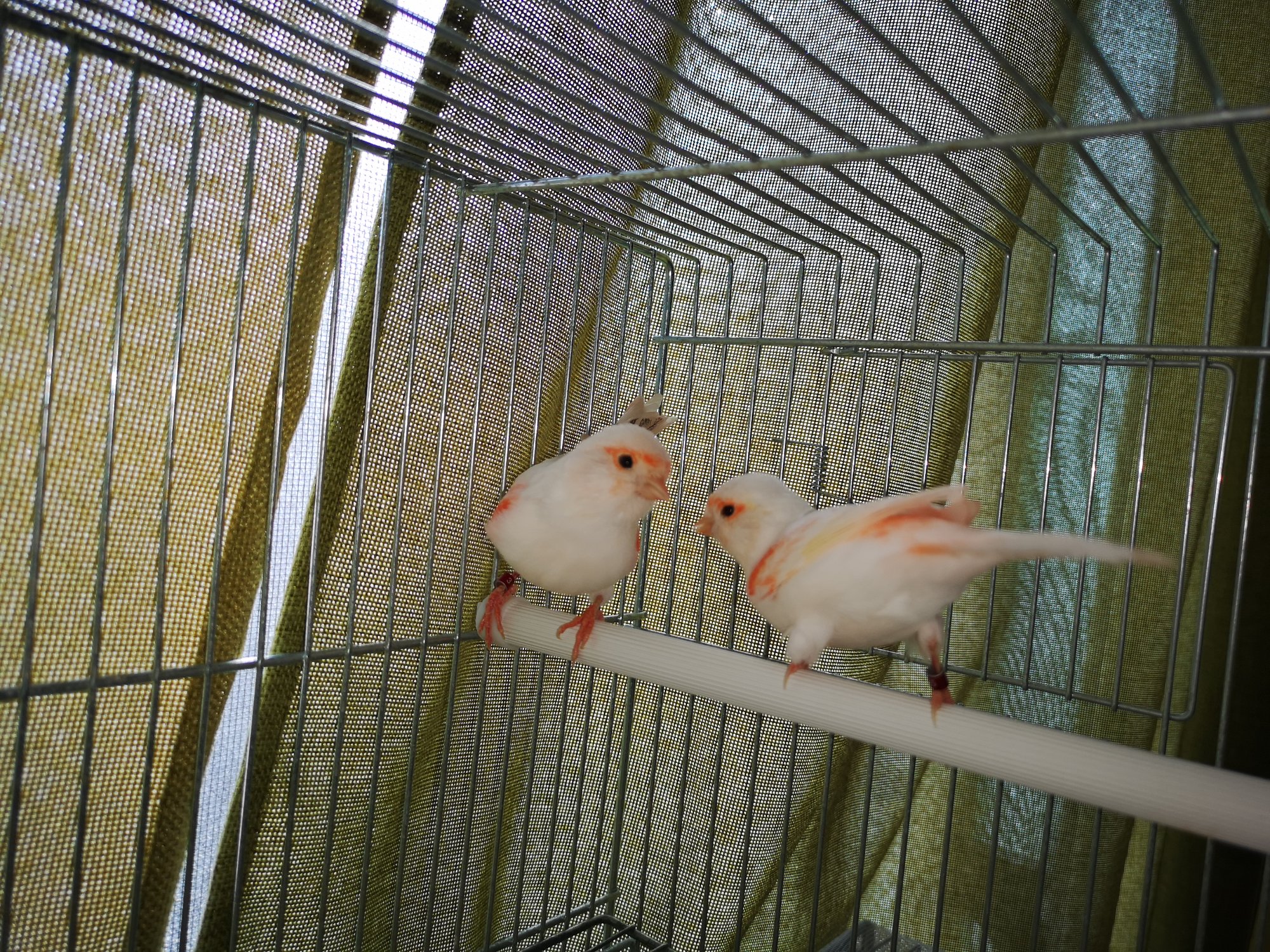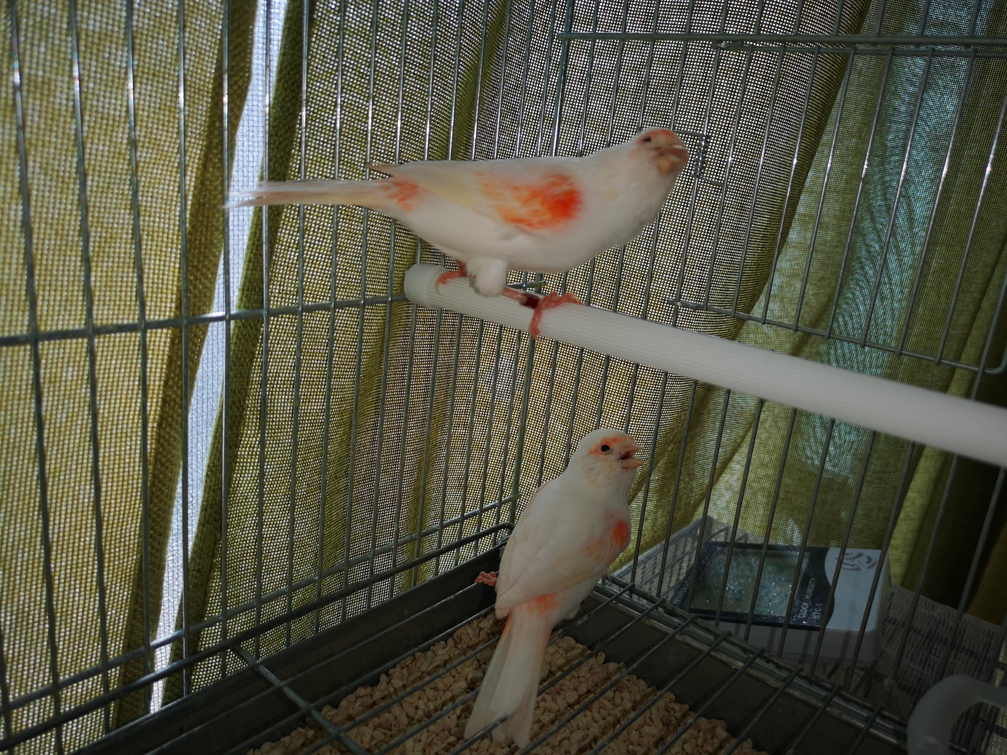 Queste foto sono di due sorelle femmine del soggetto iniziale, loro per esempio mi sembrano abbastanza bianche e gessate come femmine, ovviamente non da accoppiare col fratello ma con un canarino da caratteristiche simili. Loro hanno dorature meno evidenti nonostante abbiano avuto la stessa alimentazione.