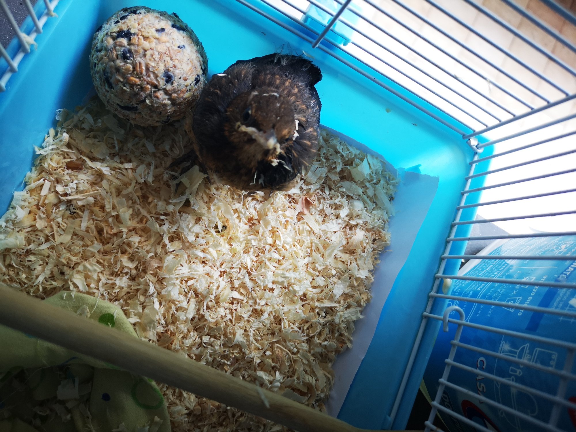 Ora è a casa con me, l'ho messo in balcone (sullo stesso lato della cantina) qui ci sono gli alberi e molti uccelli (sia merli che tordi) in una gabbietta da criceto con la porta in alto aperta sperando che la mamma lo senta.