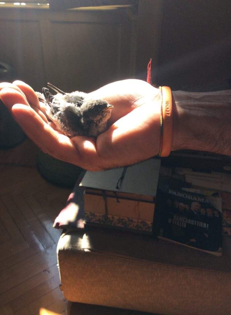 Ho trovato oggi un balestruccio evidentemente caduto dal nido, già con diverse piume, vispo, ma con gli occhi chiusi.