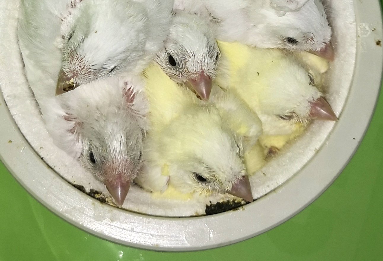 No escludevo pulli bianco recessivo già dall'inizio proprio perchè la femmina non porta bianco. Essendo la femmina gialla intensa e non potendo la femmina portare avorio (per genetica) mi chiedevo da cosa potesse dipendere questa differenza di colore fra pulli nel nido, l'unica cosa può essere che quelli più chiari sono i brinati?