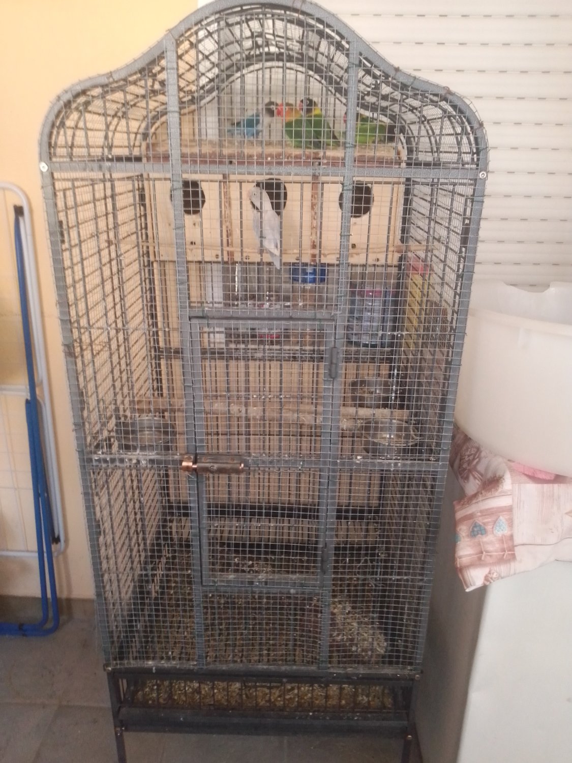 non è una voliera (per voliera s'intende una struttura ampia dove gli ucelli possano librarsi seppur minimamente in volo quindi alta almeno 2/3 m e lunga almeno altrettanto ) perciò quella è una gabbia, dalle fotografie sembra un po' troppo stretta e alta i pappagalli come per tutti gli uccelli hanno una tipologia di volo orizzontale perciò la gabbia dovrebbe essere più sviluppata in lunghezza piuttosto che in altezza, inoltre secondo me le sbarre sono un po' troppo distanti per la taglia del pappagallo è una gabbia adatta ad una specie più grande , infatti l'uccello potrebbe incastrarsi con la testa nel tentativo di uscire, gli inseparabili sono pappagalli gregari che in natura vivono in grandi gruppi perciò dovresti prendergli un compagno in modo che non si annoi ed arredarla con giochi adatti, il pappagallo è allevato a mano? Se sì dovrai interagire frequentemente con lui e lasciarlo fuori dalla gabbia almeno per alcune ore al giorno .