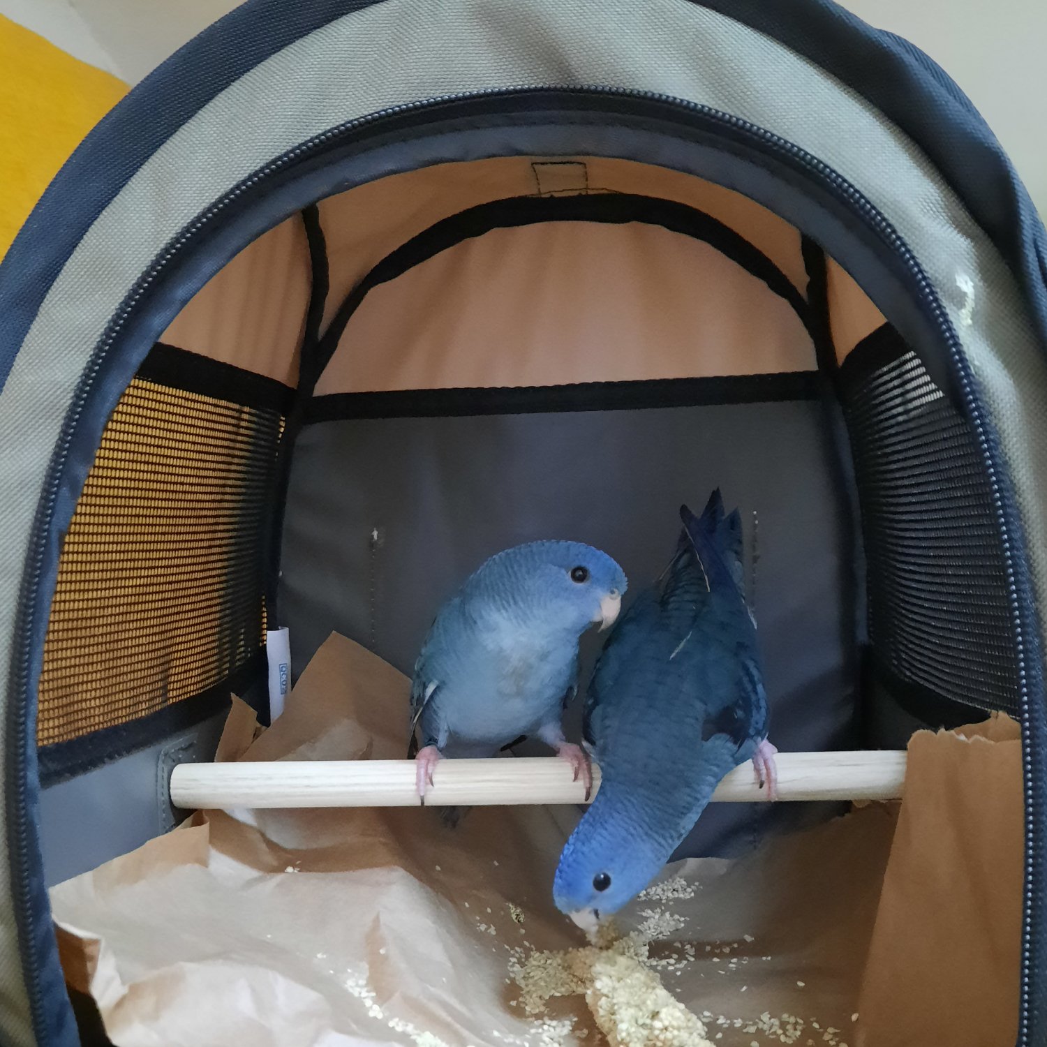 Per quanto riguarda come sono alloggiati, hanno una gabbia Montana Madeira per il giorno, e una stanzetta tutta per loro (a prova di finestrate) con una gabbia più grande ma di qualità inferiore per la sera/notte. Ovviamente loro starebbero sempre nella gabbia più grande, ma per la loro sicurezza voglio che passino la maggior parte del tempo al piano di sotto, perché la Madeira è più affidabile e perché se la temperatura lo permette possono stare fuori. Per portarli da una stanza all'altra (visto che sono su piani diversi) ho comprato un trasportino e loro veramente non fanno troppe storie. Dopo aver giocato con me la mattina presto, si fanno trasportare nella gabbia Madeira per la colazione. Poi il pomeriggio sono felici di tornare su e avere altro tempo per giocare con me. Poi si mettono tutti e due carini insieme e dormono. Dolcissimi!