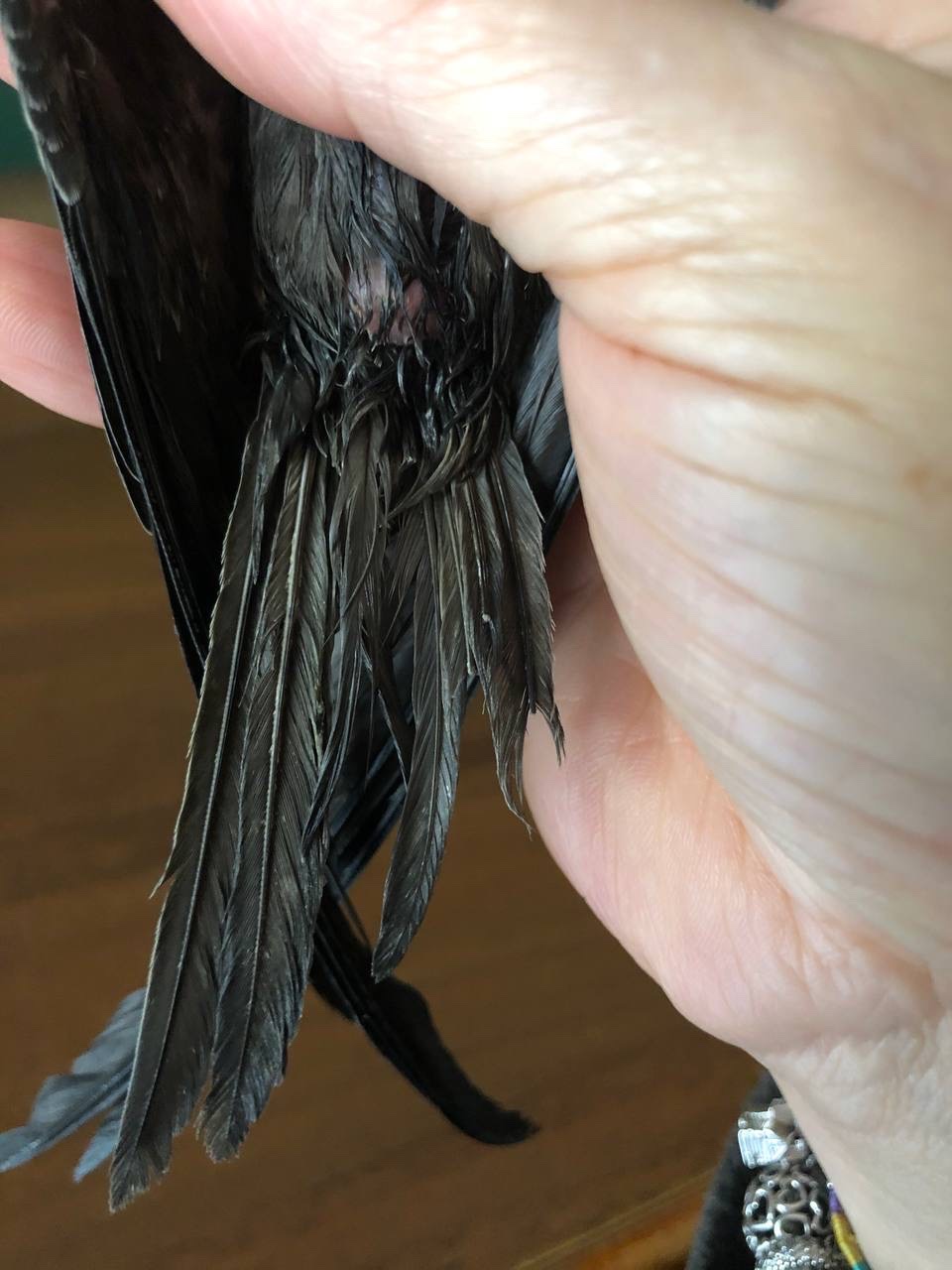 La coda presenta appena 3 penne integre su 10 che dovrebbero essere. I monconi andrebbero estirpati alla radice per permettere la crescita di penne nuove; questo è un bel problema, perché la generazione di nuove penne comporta un notevole dispendio di energie da parte dell'animale e ogni timoniera impiega non meno di 4 settimane per formarsi completamente.
