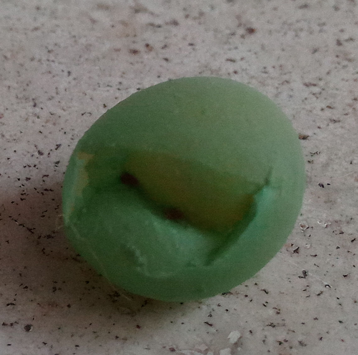 Ieri ha deposto il primo uovo, ma stamattina il secondo è mollo e anche ammaccato. Osso di seppia presente. Pastoncino con gusci di uova pure.