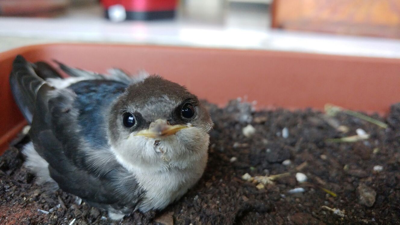 Lo scorso giovedì 27 luglio ho trovato in un parco un piccolo balestruccio (foto in allegato) a terra che tentava goffamente di svolazzare, ma riusciva solo ad alzarsi di pochi centimetri sbilanciandosi in avanti col corpo e rischiando di capovolgersi. Così l'ho raccolto e portato a casa, dove l'ho sistemato in una "gabbia" artigianale composta da una cassetta capovolta (tipo quelle che si usano per la frutta, è abbastanza alta quindi volendo ha lo spazio per svolazzare) con sotto una vaschetta in cui ho messo un po' di terra, qualche fogliolina e qualche rametto, e un guanto di pile nel caso l'uccellino avesse avuto bisogno di un qualcosa di più comodo e caldo.