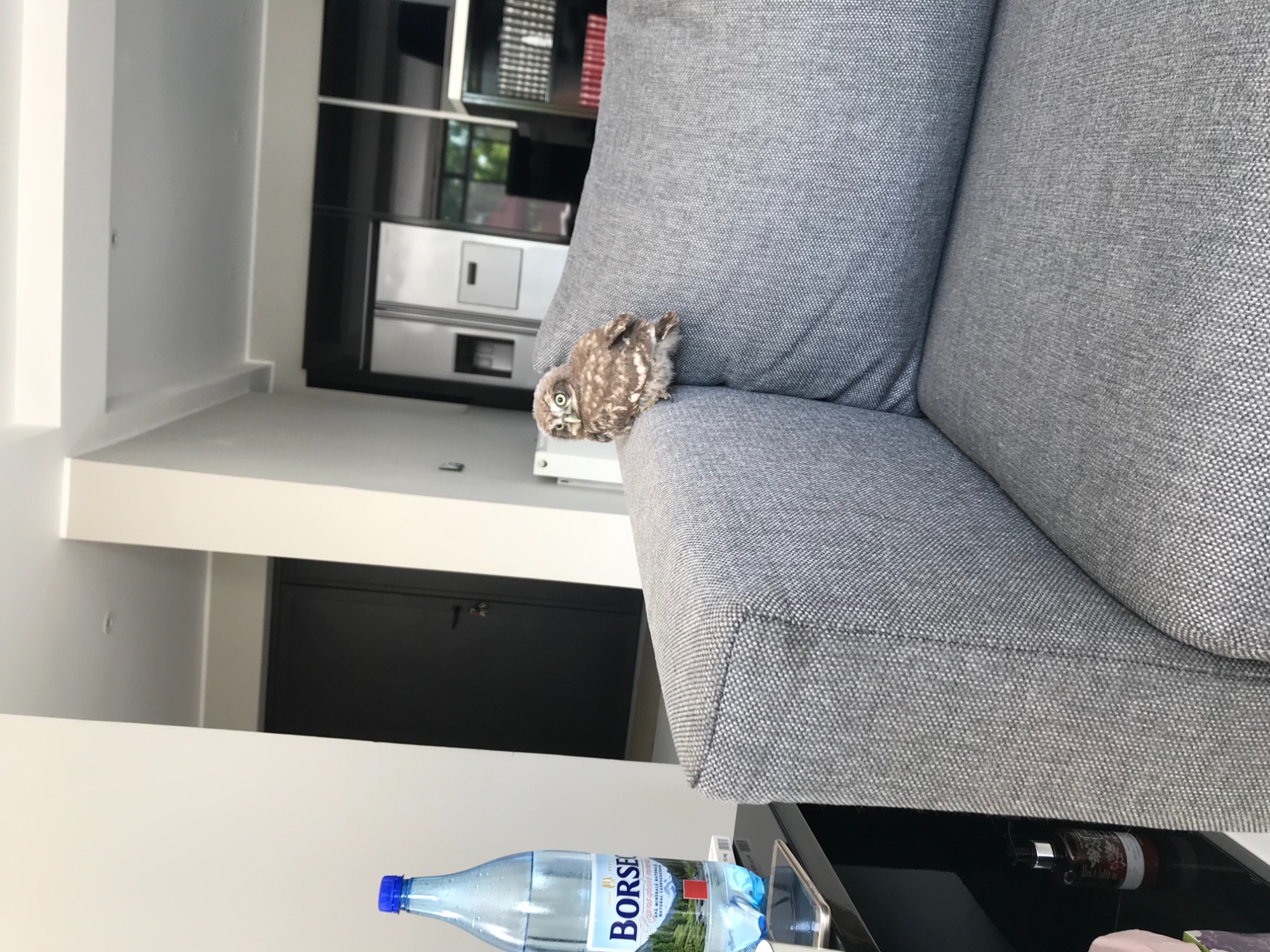 La civetta cresce una meraviglia, anche il piumaggio. Adesso mangia da sola, metto la carne nel suo rifugio e mangia da sola. Sta mattina ho trovato il recipiente di plastica nel quale metto il cibo nel giardino ovviamente vuoto. Credo che aveva deciso di prendere il pasto fuori casa :Lol Spesso la mattina è nel giardino ad un passo dal suo rifugio guardando la natura, uno spettacolo! Anche la mamma civetta e presente sempre, giorno e notte. Anche lei mangia dei bocconcini di pollo o tacchino che lascio ogni sera apposta per lei. Ormai sa che quello è per lei. Quando mi vede non vola più via. Se prendo il piccolo e mi metto nel qualsiasi punto del giardino vola subito direttamente nella sua “ cuccia” . Il suo volo è basso, circa 1 m da terra. A questo punto mi domando quando andrà via, sono oramai 17 giorni che soggiorna da me.