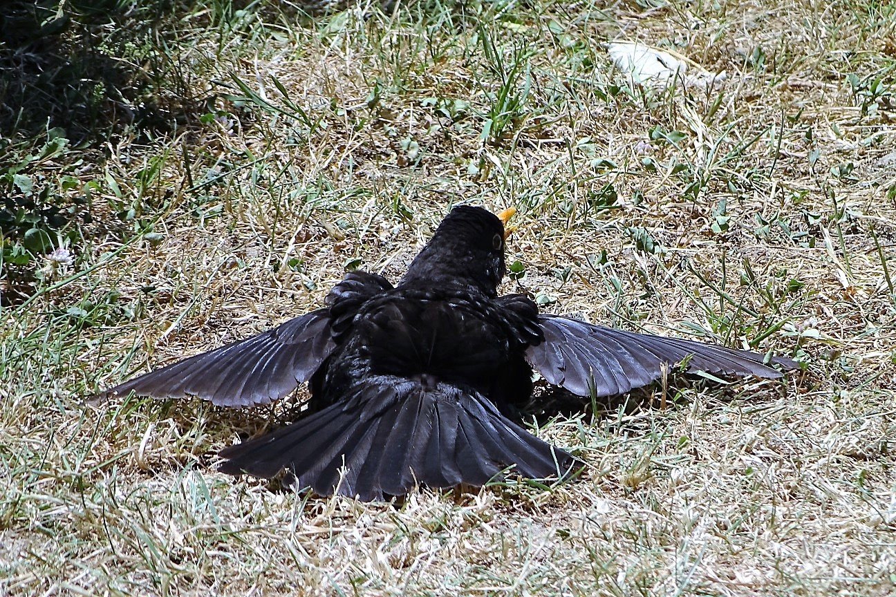 Per quanto riguarda il merlo che hai visto nel suolo con le ali aperte, è un tipico atteggiamento di deparatizzante, (non so si si dice cosí), spiegato con altre perole, che il sole entre tra le piume ed uccida i parassiti.