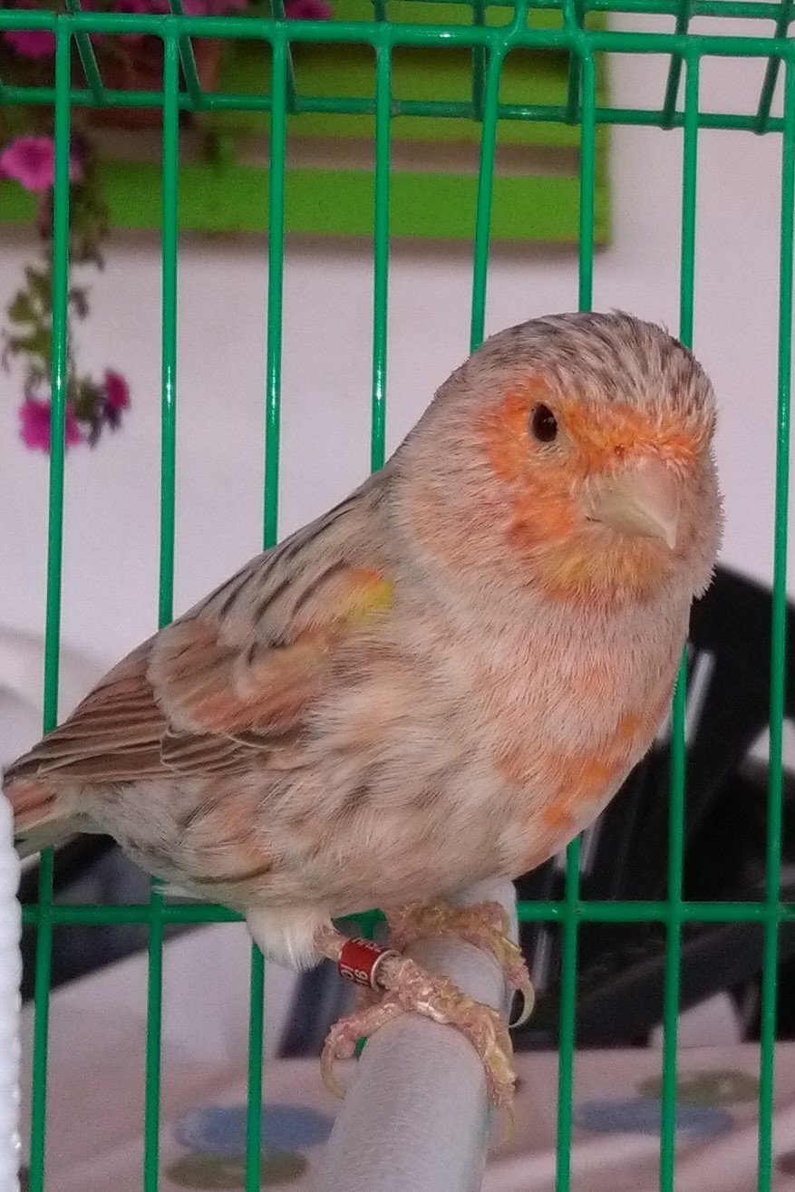 Ciao, quasi sicuramente è un canarino Agata rosso mosaico molto probabilmente mutato (topazio, pastello) vedi di che colore è l'occhio alla luce e magari manda una foto della schiena in modo da vedere il colore del disegno e delle penne. È un canarino 2016 c'è scritto sull'anello.