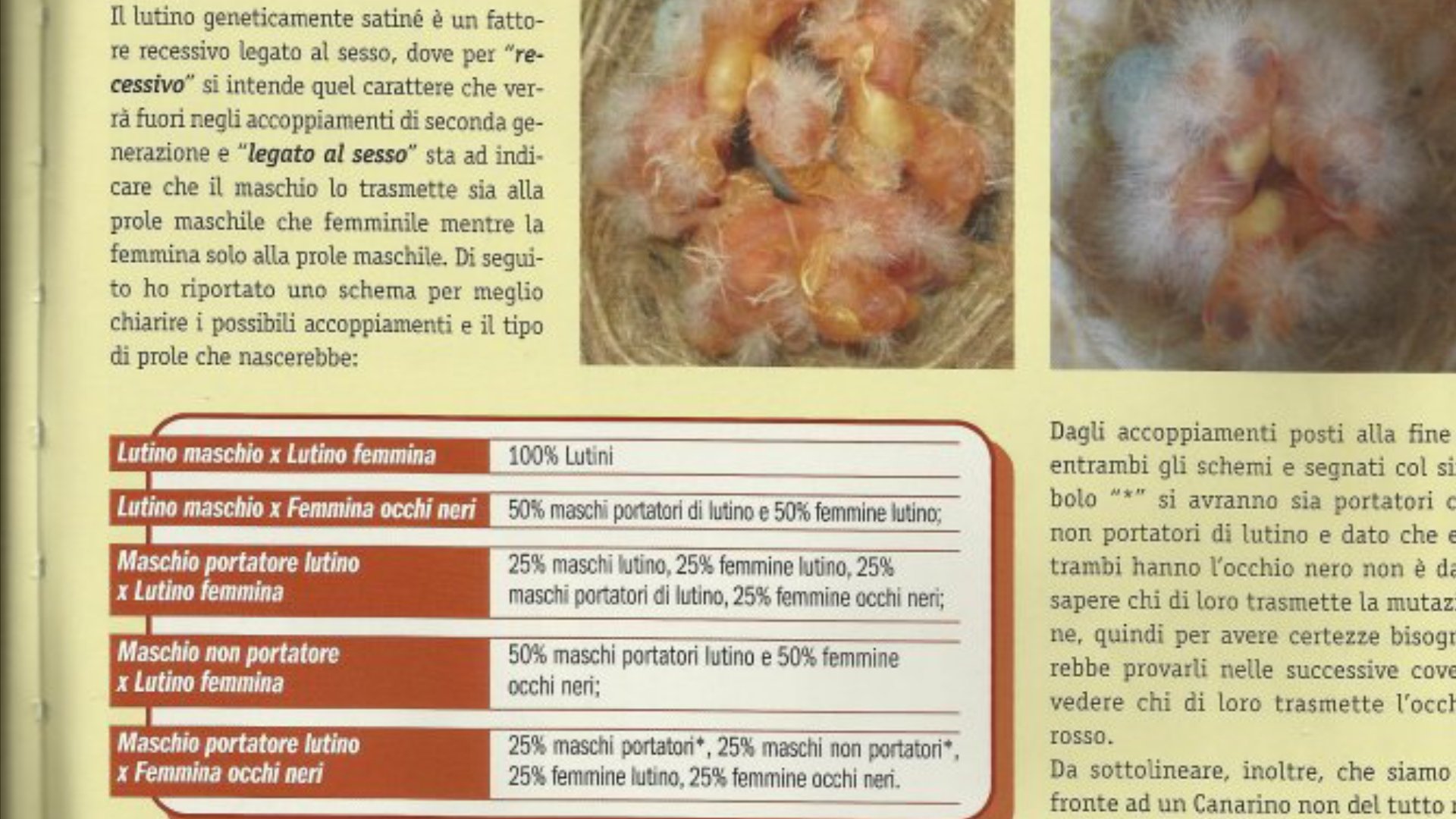 Ciao, come fai a stabilire dei 4 maschi chi è portatore e chi no? da poter eventualmente accoppiare alla sorella, secondo me il top nel tuo caso sarebbe trovare altri 2 soggetti lutino mosaico giallo, il maschio portatore da mettere con la tua femmina lutina e 1 femmina lutina (sempre mosaico) da provare con un paio di maschi, così avresti dalla prima coppia già quest anno lutini mosaico e dalle altre nidiate nella peggiore delle ipotesi avresti portatori sicuri (nel caso i tuoi non lo fossero) e in più avresti sangue nuovo per creare il tuo ceppo.