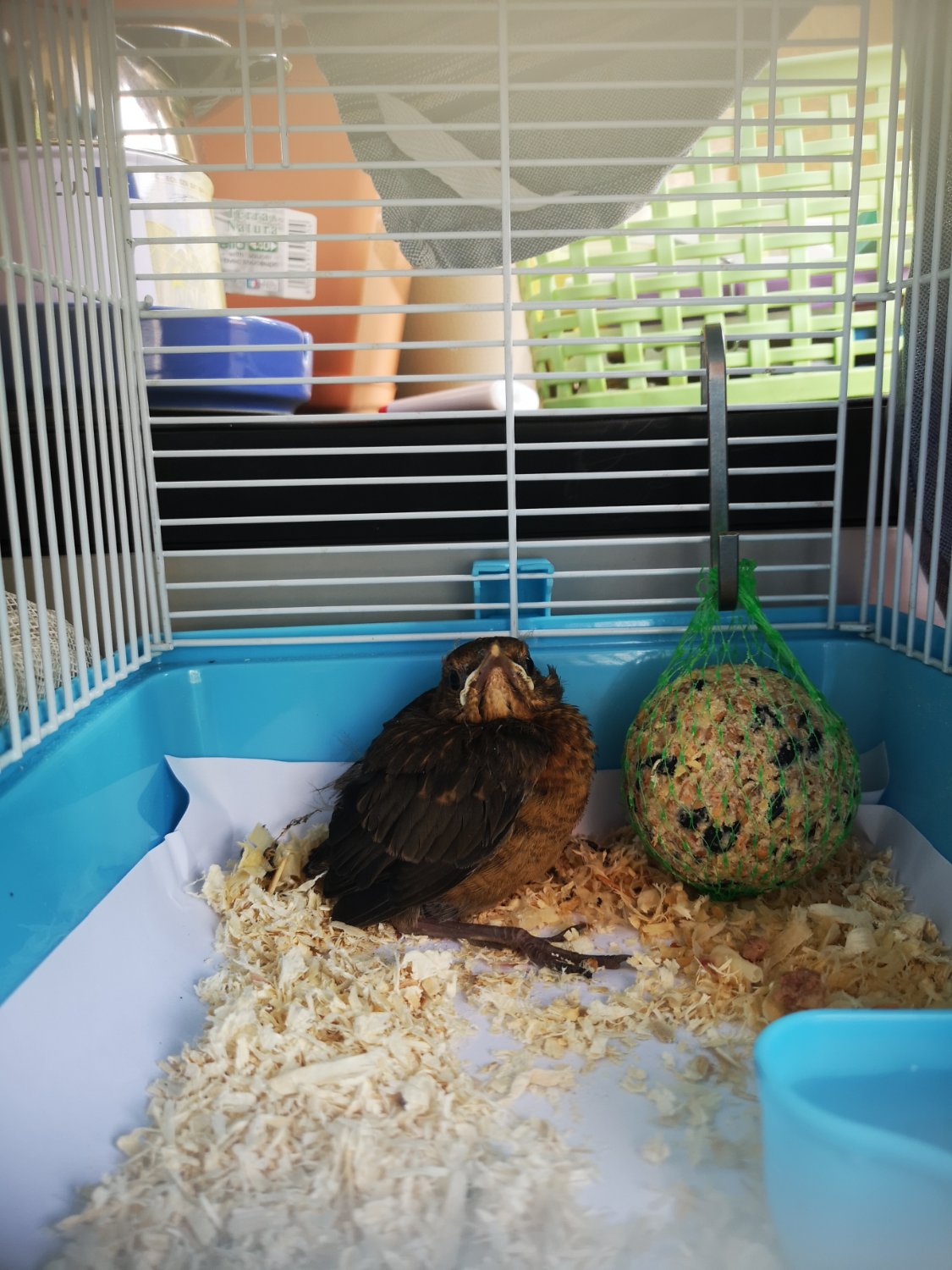 Ora è a casa con me, l'ho messo in balcone (sullo stesso lato della cantina) qui ci sono gli alberi e molti uccelli (sia merli che tordi) in una gabbietta da criceto con la porta in alto aperta sperando che la mamma lo senta.