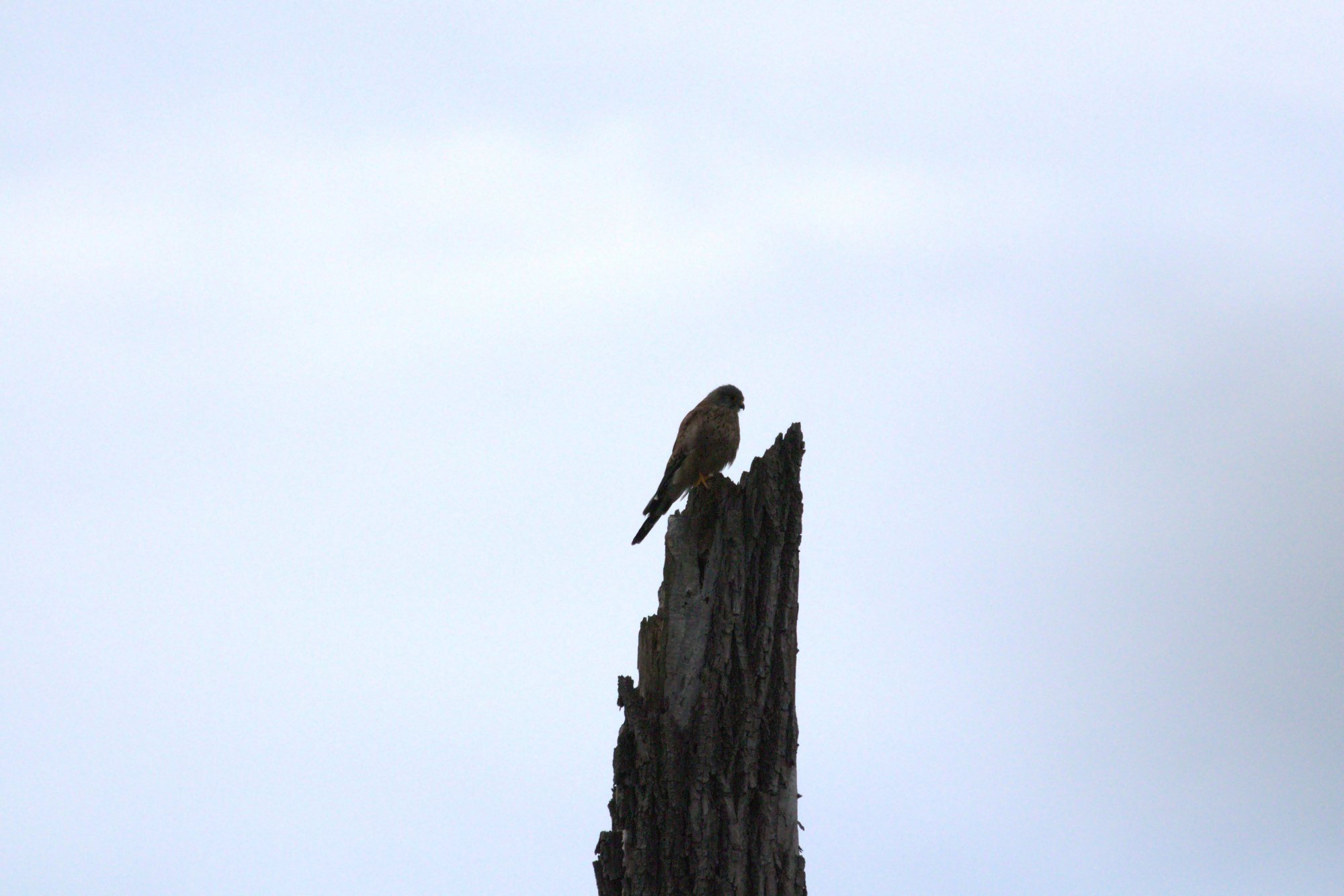 La qualità della foto lascia qualche dubbio ma, dalla gocciolattura densa che dal petto si estende fino al ventre, il poco contrasto tra parte inferiore e superiore, la base del sottocoda che mi pare di un colore piuttosto chiaro e gli artigli che mi sembrano neri, direi senza troppi timori che si tratti di una femmina di Gheppio ( Falco tinnunculus).