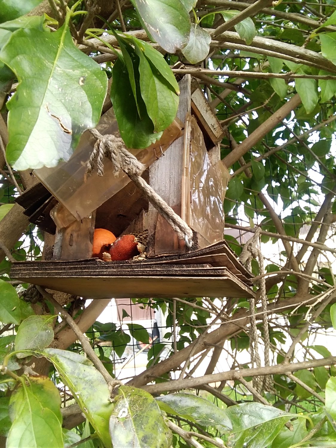 Quello è l'angolo dove dall'interno di casa mia, da un punto di osservazione, al mattino vedo dei merli in attività, così ho pensato che potrebbero esser questi uccelli a portare pezzi di mandarini dentro la casetta per poi consumarli tranquillamente, protetti dall'attacco di predatori e o gatti. Infatti il giardino è spesso sorvolato da poiane e frequentato da gatti randagi. Per non parlare dei rapaci notturni certamente presenti (ne sento il verso all'imbrunire)