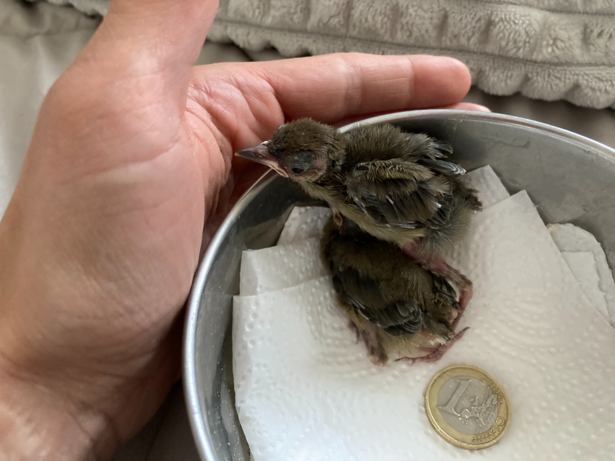 Buongiorno a tutti, ho 4 pulli che presumo siano di merlo, ma mi sembrano parecchio piccoli, allego una foto con moneta per capire le proporzioni.. il nido è stato trovato in una siepe tagliata per errore, nido bello rotondo come quello dei merli.. l’unico dubbio sta proprio nelle proporzioni di questi pulli che sono davvero minuscoli sembrano pulli di passerotto.. inoltre vi chiedo se già impiumati così posso spegnere la lampada calda.. ora la temperatura si assesta tra i 25 e i 28 gradi.. posso tenerli già ai 20 gradi della stanza? Grazie mille in anticipo per le risposte!
