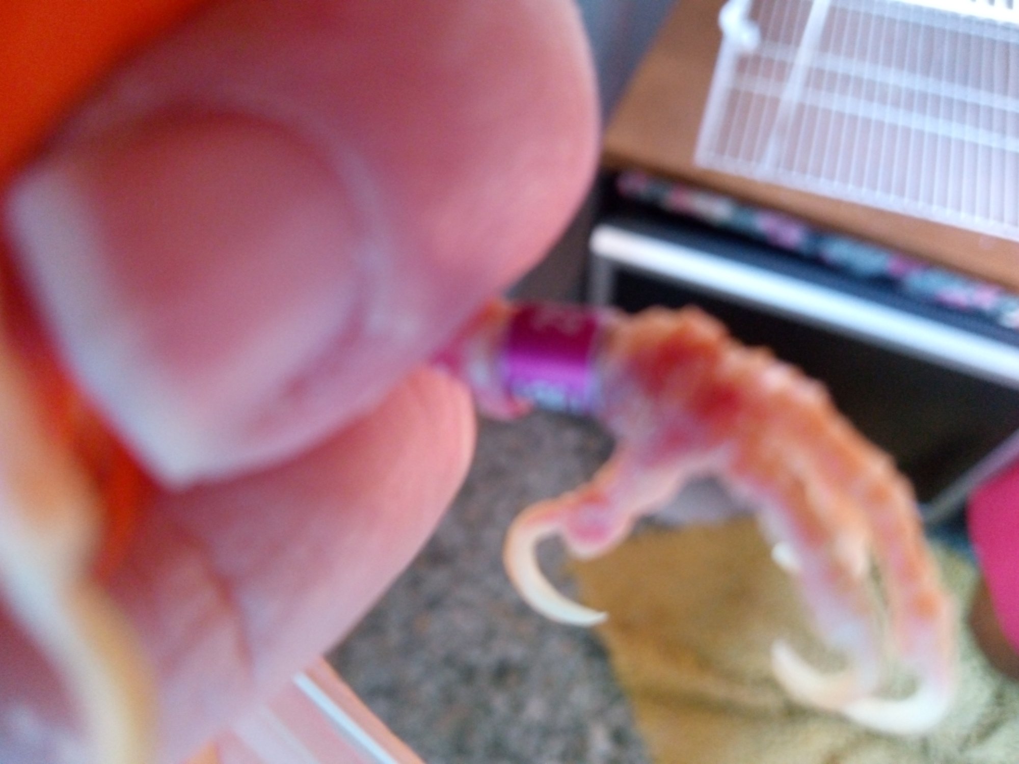 Ho scattato la foto con il cell. Me ne sono accorta domenica e lunedì sono corsa subito a comprare le forbici. Però sembra che si stia riprendendo. Giá ieri mangiava e stava sul posatoio. Forse non aveva più sensibilità alla zampina perché non si è lamentato per nulla quando è successo l'incidente. Grazie