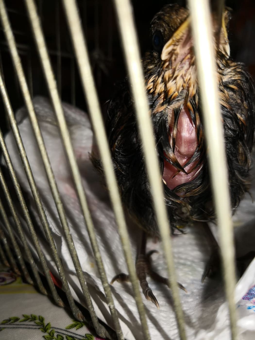 L' ho messo dentro a una gabbietta e per dargli da mangiare lo devo sempre prendere in mano, lo sto nutrendo ogni quattro ore in questi due giorni gli ho dato uova sode, mela e omogenizzato di manzo.