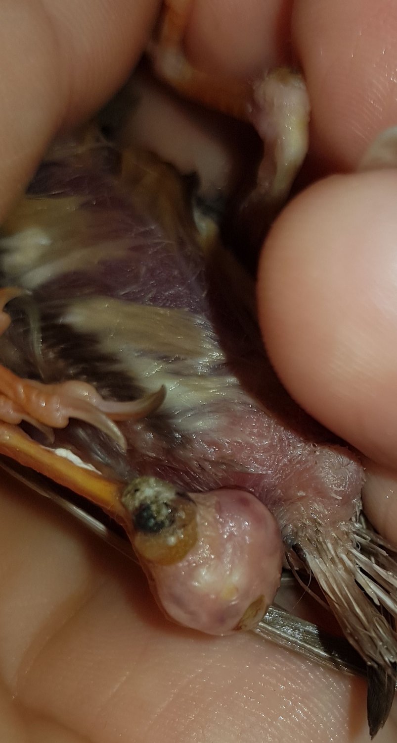 Detto cio..ha una bruttissima infezione a una zampetta dovuta a ad aversela sicuramente graffiata sul fondogabbia o ppure ha subito una puntura di una maledetta zanzara......l infezione va pulita disinfettata con un cotonfiocco imbevuto di acqua ossigenata fino a togliere la parte molto infezionata e poi disinfettare con tintura di jodio...
