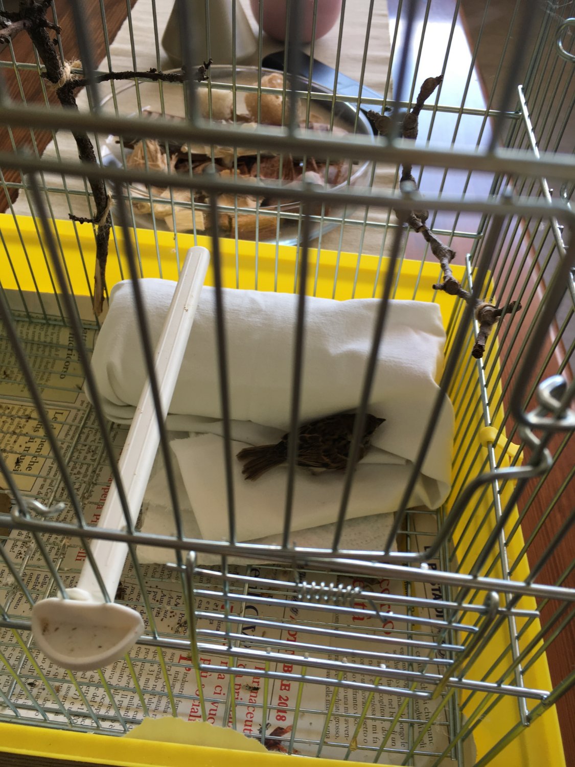 Mi sembra in buona salute, gli ho dato qualche goccia d’acqua sulla punta del dito e l’ha bevuta. L’ho messo nella gabbia di Lino con la solita bottiglia d’acqua calda avvolta in un panno, non perché faccia freddo ma per farlo sentire sicuro, era chiaramente spaventato. Mi dareste i vostri preziosi consigli su come comportarmi ora per questo passerotto? (almeno credo sia un passerotto).