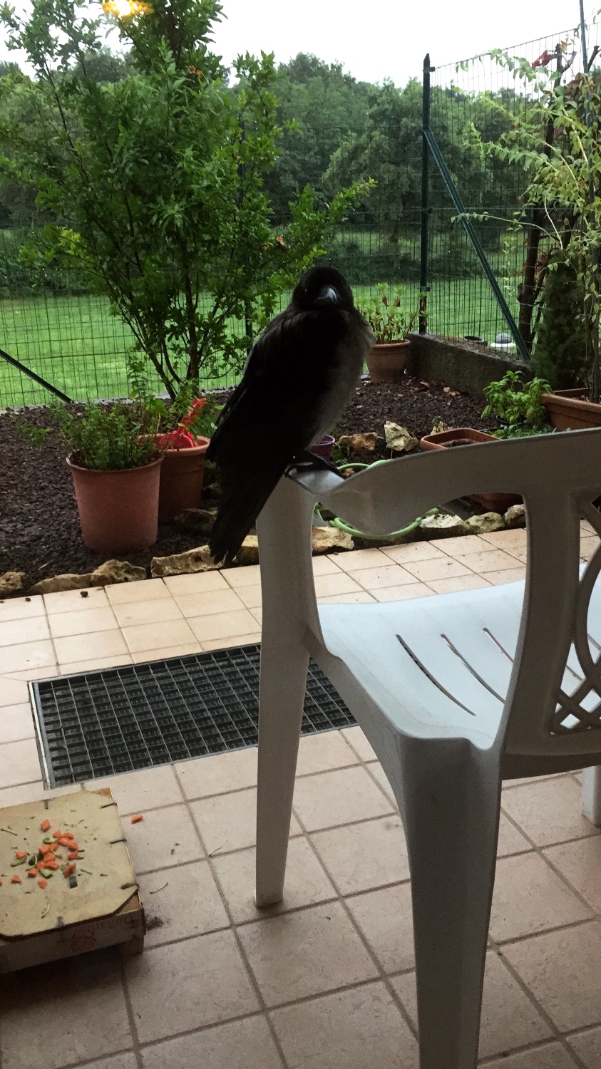 L’ho accudito fino a che non è diventato autonomo sia con il cibo che con il volo. Sebbene faccia voli brevi da un albero al tetto rimane sempre qui in zona a zappettare tutto il giorno nel campo di fronte, qualche giorno fa é tornato da me e l’ho trovato non molto bene, pieno di parassiti (Mosca cavallina) e pulci, gli ho dato nuovamente da mangiare lanciandoglielo nel prato e ora continua a cercarne. Non sembra molto interessato ad interagire con le altre numerose cornacchie della zona ed io non vorrei che perda la sua “selvaticitá” (ogni volta che mi vede mi viene in contro).