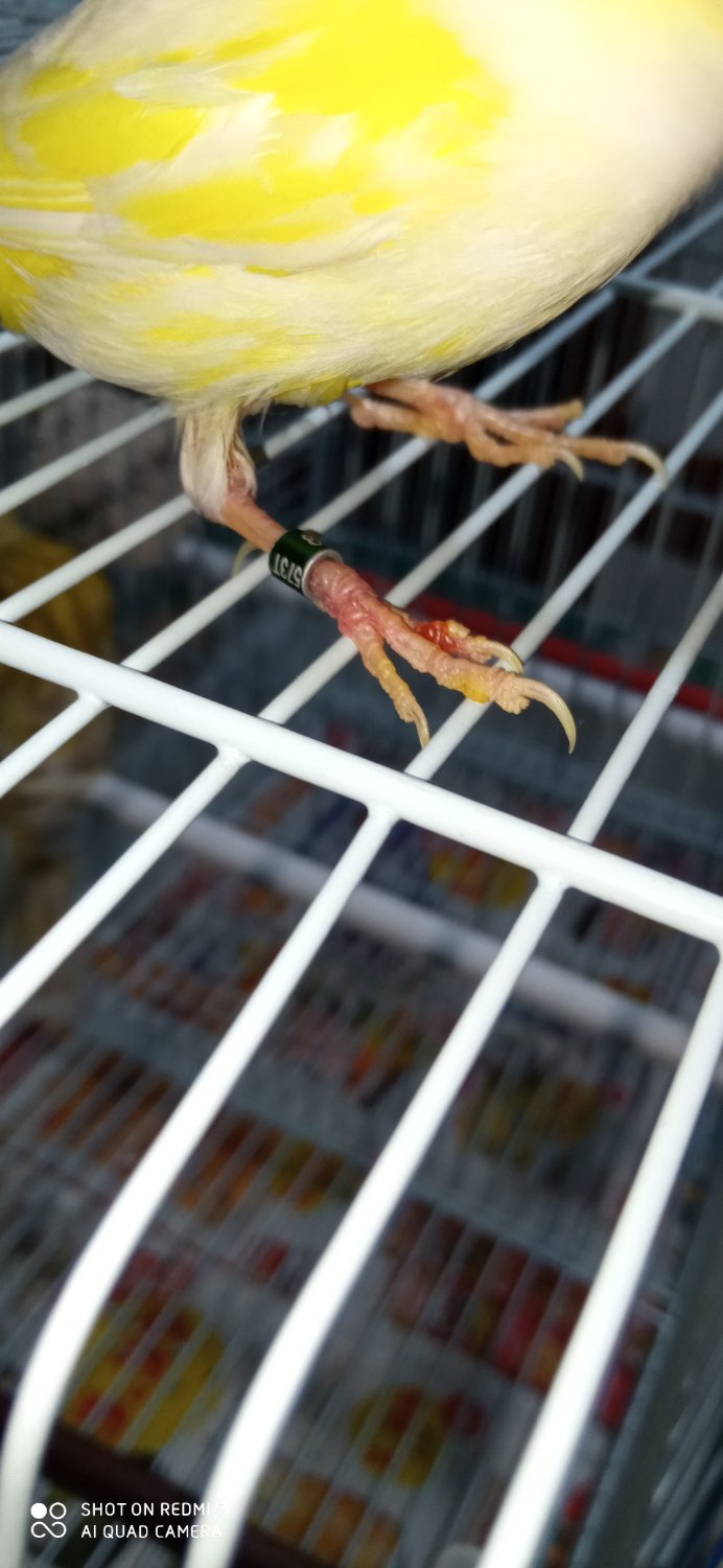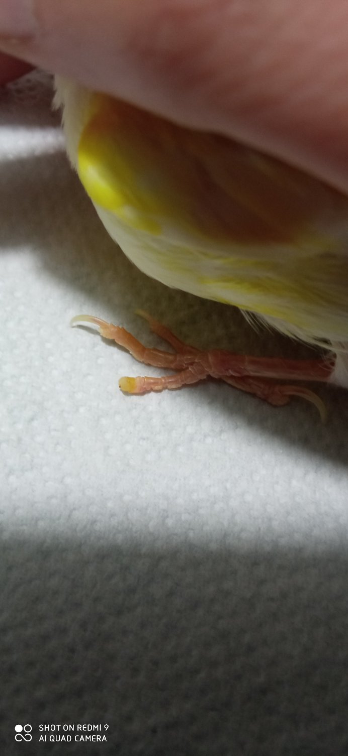 Inoltre, una settimana fa la mia canarina ha perso l'unghio del dito sinistro anteriore della zampa sinistra e parte iniziale del dito è bianca. Ho continuato a mettere anche lì Iruxol crema.
