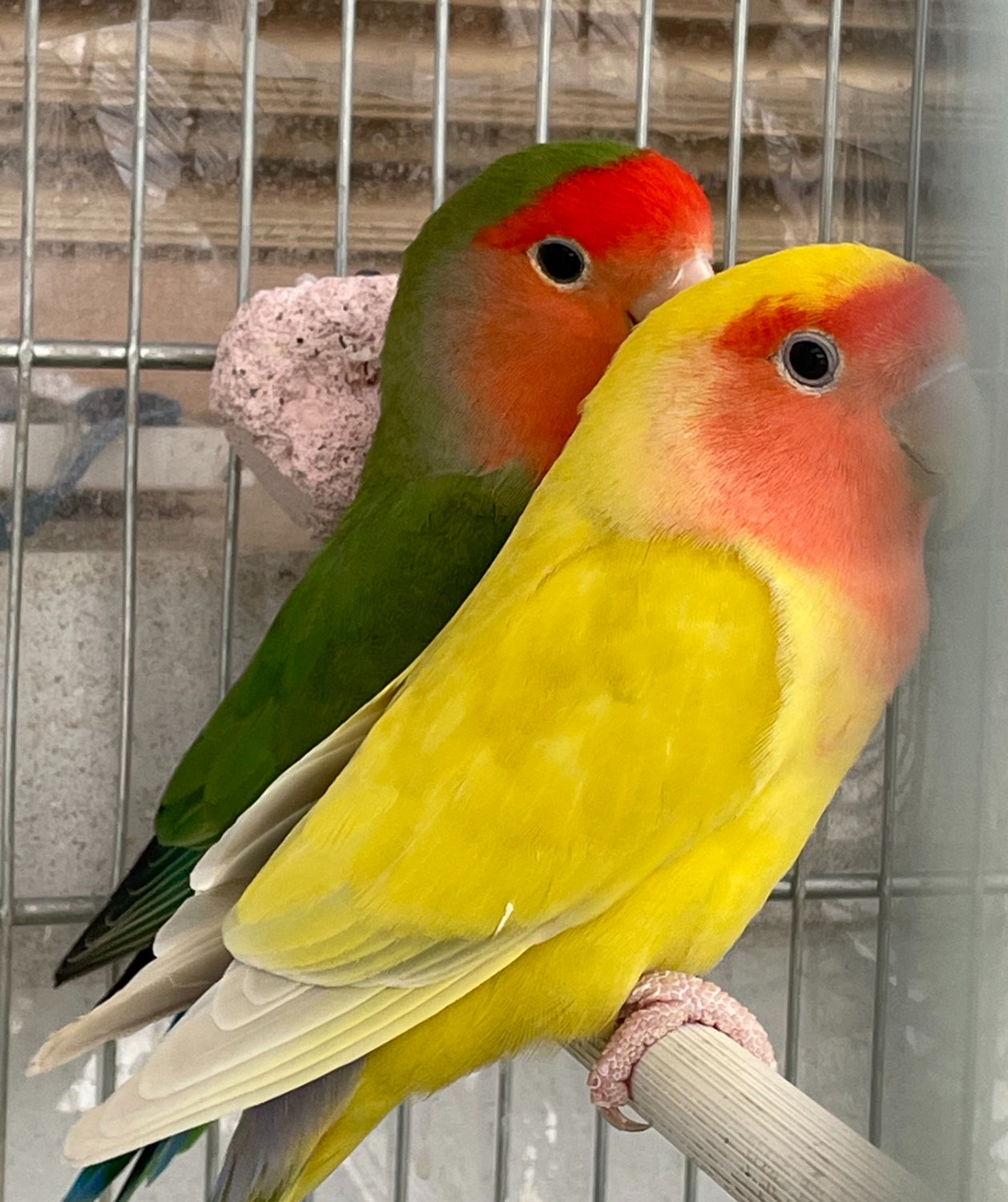 Ho una coppia di agapornis roseicollis che credo siano un ancestrale (M) e un lutino (F). Quest anno hanno avuto due piccoli che da sessaggio molecolare sono risultati due maschi e che credo essere un lutino e un pezzato serie verde.