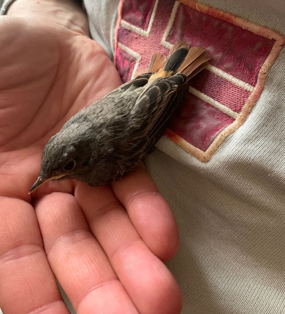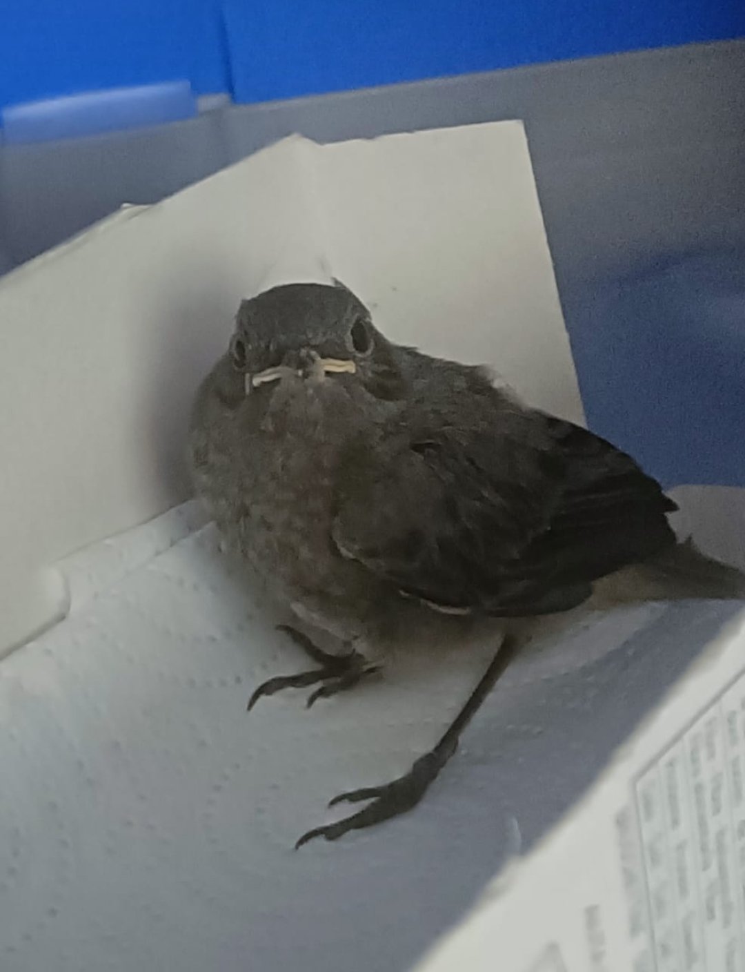 Non so che uccello sia (da Google foto mi esce codirosso spazzacamino) ne cosa debba fare. Sono andato in un negozio di animali e ho comprato un mangime su consiglio del negoziante. Ho fatto una pappetta e dopo che si è tranquillizzato, ha mangiato un pochino. Adesso l'ho messo al sicuro con una coperta di pile.