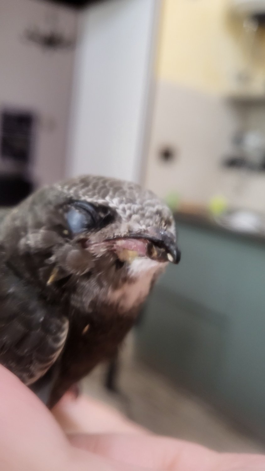 Salve, ho trovato un rondone adesso ha più di 20 giorni che sta a casa con me, sembrava andasse tutto bene fino a quando stamani l'ho trovato con il becco in queste condizioni. Gonfio e sembra si stia come squamando. Cosa posso fare sto aspettando i grilli xke fin ora è stato alimentato a camole della farina.