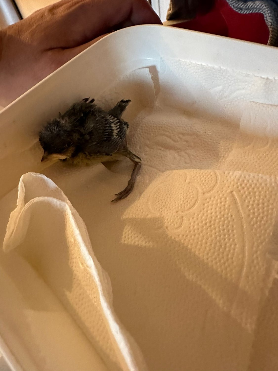 Adesso è in una scatola di cartone con coperchio bucherellato, zampetta, apre parecchio le ali, inciampa e rotola su se stesso, sembra stia molfo meglio di ieri. Ora gli stiamo dando omogeneizzato di pollo.